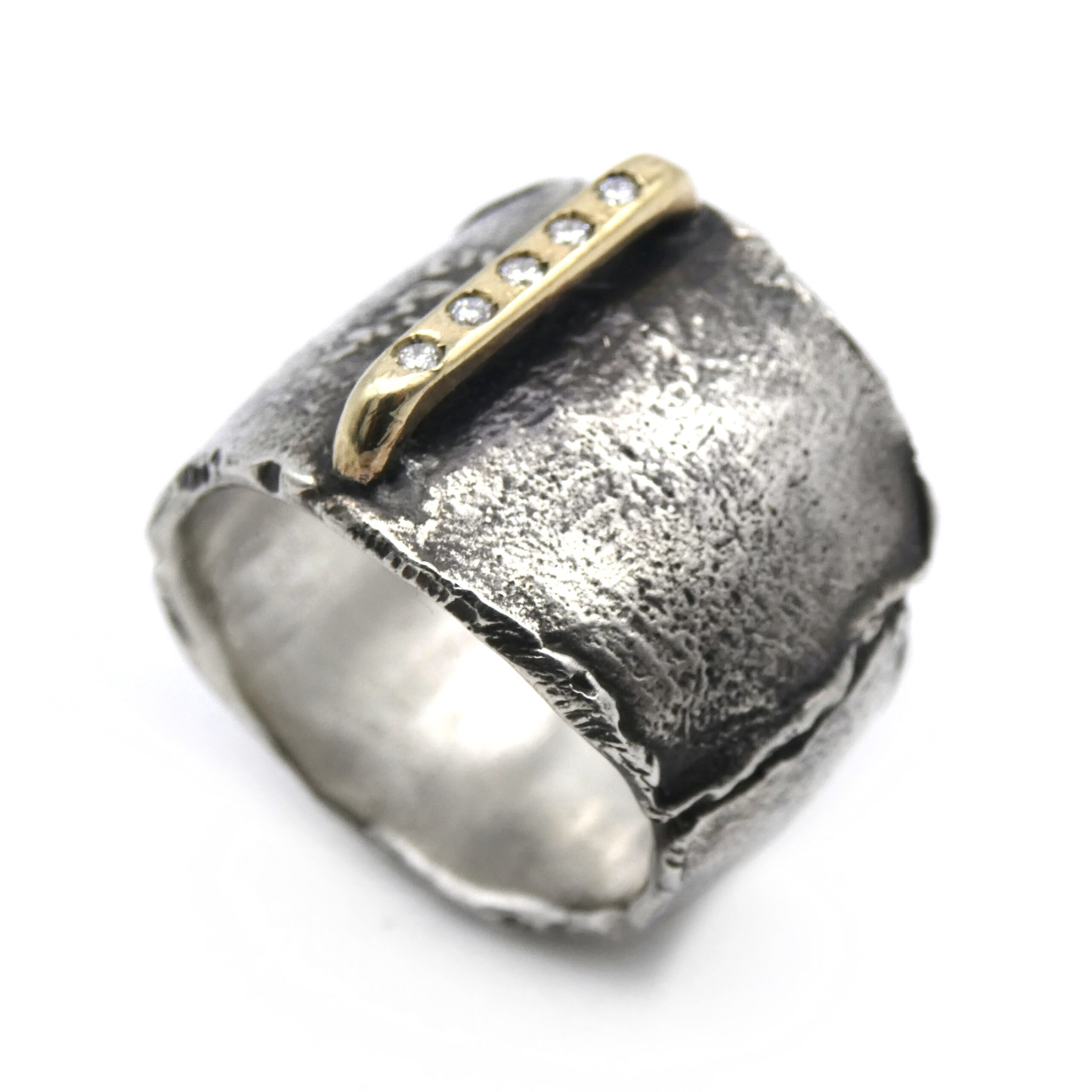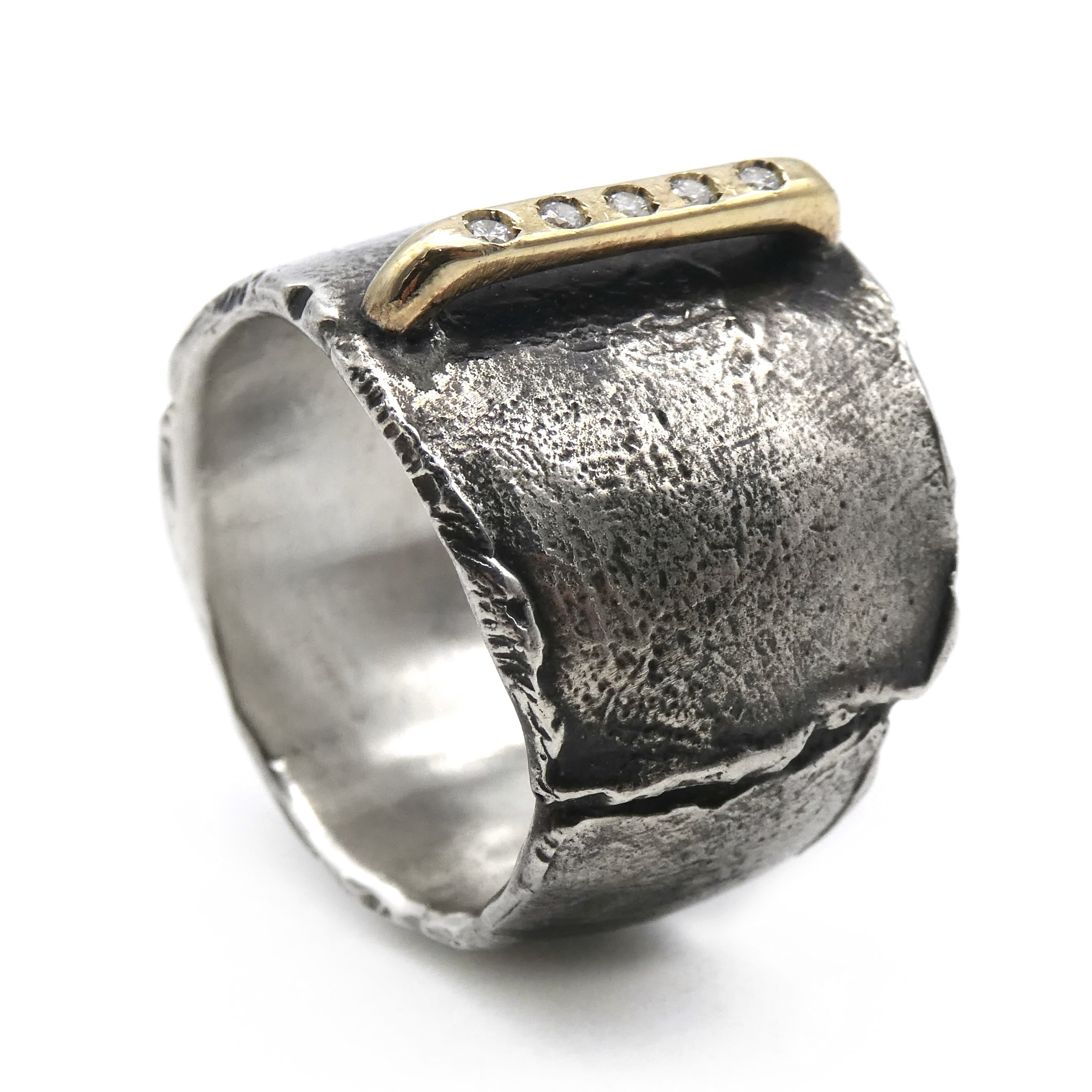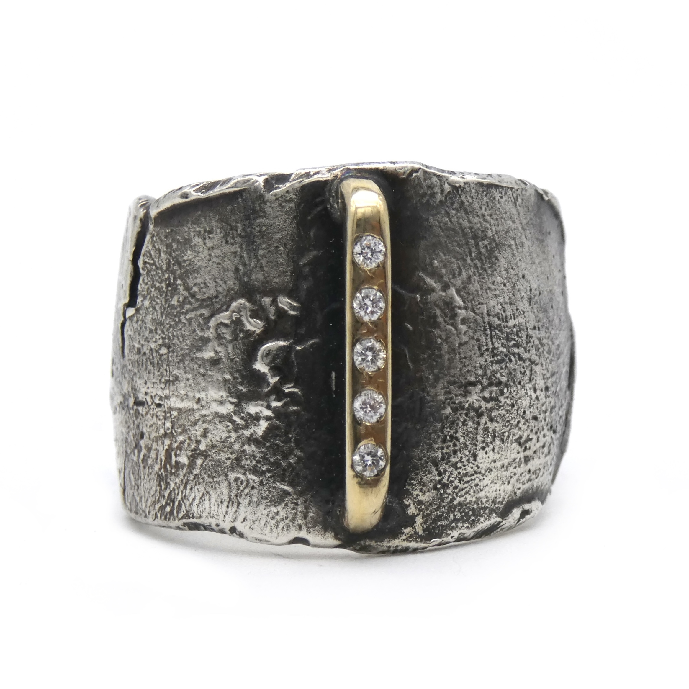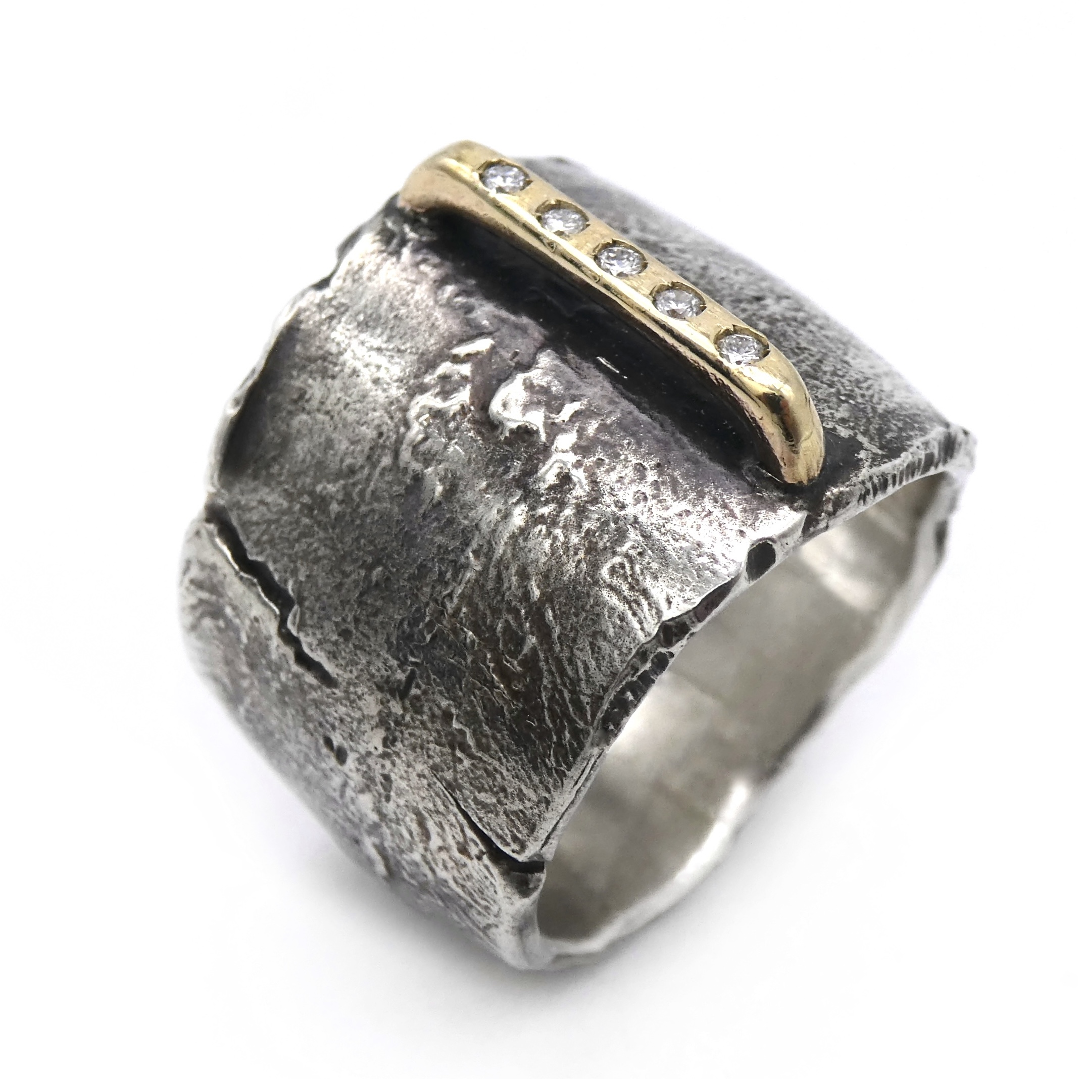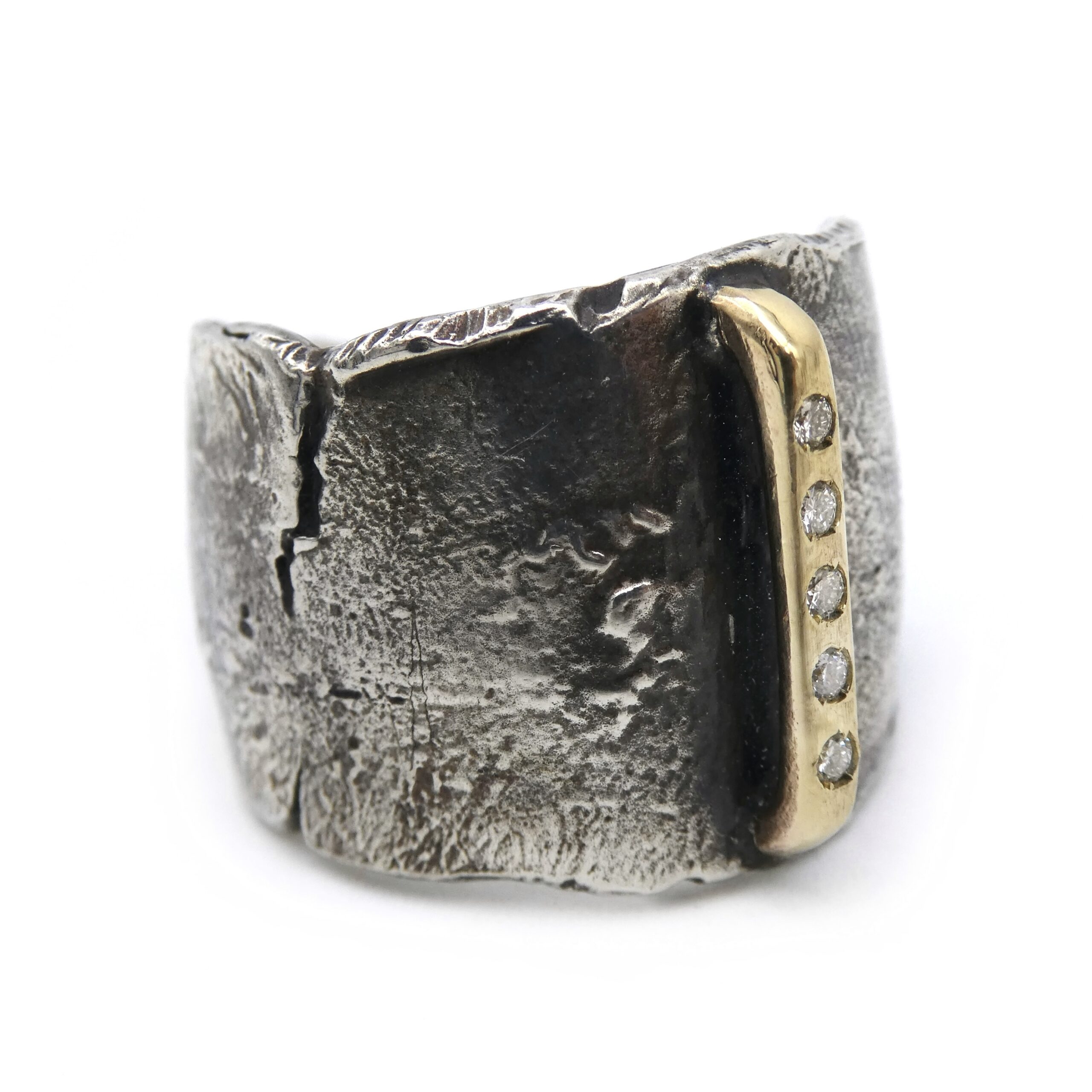 Across the top sits a 9 kt yellow gold bar, fused directly onto the silver and set with five natural brilliant-cut diamonds. A sharp contrast between brutalism and refinement—between primal energy and pure light.